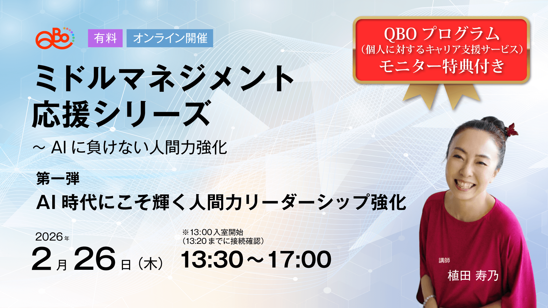 今回の第一弾のセミナーでは、令和時代のミドルマネジメントに求められる「ワークエンゲージメント」や「人間力」の考え方を理解し、ご自身のリーダーシップにどう活かすかを学びます。AIに負けない人間力とは何かを共に学んでいきましょう。