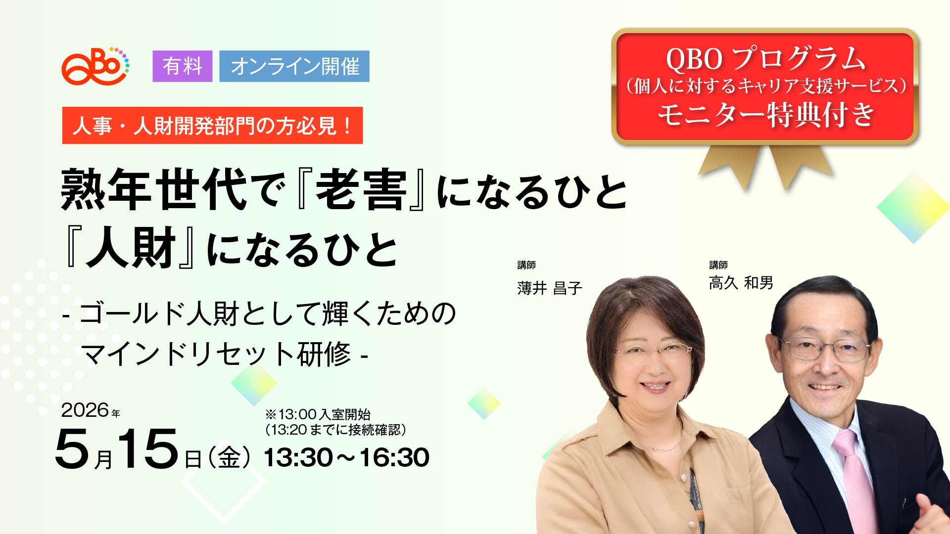このセミナーの講師はいずれも入社以来同じ会社一筋で働き、定年退職後は継続再雇用を続けながら、セカンドキャリアとしても働いています。その間、闘病生活や介護など、様々な経験を経ている講師だからこそ語れる、「ゴールド人財」になるためのマインドセットについて学んでいただく機会とします。