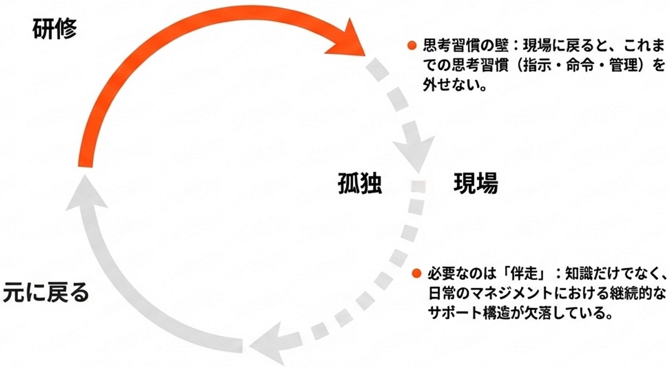 現場実務に忙殺され、「ビジョン構築」や「動機づけ」ができない。